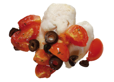 - Aggiungere al pesce i pomodorini cherry e le olive.
